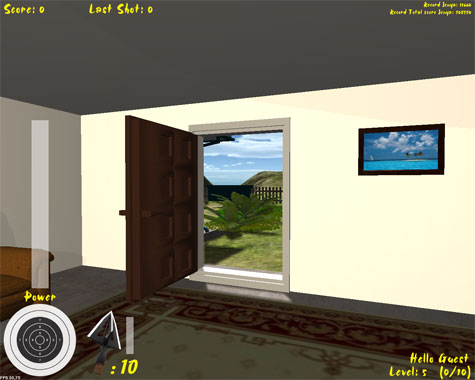 Игру вы начнете внутри здания на стрельбище. Можно сразу покинуть его и прямиком направляться к стенду для стрельбы из лука. По дороге можно включить магнитофон, чтобы стрелять было веселей. Необходимо взять лук и разместившись за стендом стрелять по мишеням, желтый флажок у которых поднят вверх. Для стрельбы зажимаем правую кнопку мыши (натягиваем тетиву) и не отпуская правой – жмем левую (выстрел). Да, не забывайте целиться.